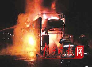 昨天(4日)凌晨時(shí)分,記者接到市民李先生報(bào)料后迅速驅(qū)車趕往現(xiàn)場(chǎng),過了機(jī)場(chǎng)高速翠屏山匝道口時(shí),已經(jīng)能聞到空氣中有一股濃濃的焦味。又開了兩公里后,道路開始擁堵起來,不久車輛便完全停滯下來,無奈之下記者只得棄車徒步趕往現(xiàn)場(chǎng)。直至兩公里開外,終于看到了失火的運(yùn)輸車,只見運(yùn)輸車車廂已經(jīng)被濃煙籠罩,車廂里不停傳出“噼里啪啦”的爆響,從車廂縫隙處可見紅光閃閃。不一會(huì)兒,“砰砰”兩聲巨響傳出,車輪燒爆后炸破了車廂擋板。記者這才發(fā)現(xiàn)8輛寶馬轎車正在火籠中“煉獄”,輪胎、塑料部件已經(jīng)在燃燒,無人敢靠近。交警為防止車輛爆燃,危及過往車輛,封閉了所有往機(jī)場(chǎng)方向的入口,并對(duì)現(xiàn)場(chǎng)車輛和人員及時(shí)疏散。該運(yùn)輸車兩側(cè)油箱裝滿了柴油,火勢(shì)如無法得到有效控制,繼續(xù)下去,分為兩層擺放的轎車一旦轟然坍塌,恐怕會(huì)造成油箱爆炸。不久,又有兩輛大型消防車趕到現(xiàn)場(chǎng)增援。消防員冒險(xiǎn)撬開車廂擋板,用5條水龍對(duì)火舌猛烈噴水。直至凌晨1點(diǎn)左右,火勢(shì)才被完全控制,但總價(jià)值400多萬的4輛寶馬5系和4輛寶馬3系轎車幾乎成了一堆廢鐵。