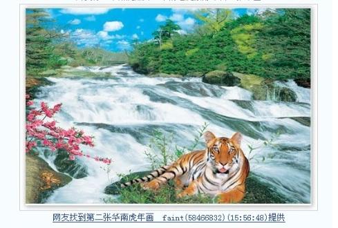 2、2007年11月15日晚九時(shí)許,網(wǎng)友"攀枝花xydz"在色影無(wú)忌華南虎臨時(shí)論壇里發(fā)帖稱:"老虎是假的。我今天仔細(xì)看我家的一副掛在墻上的老虎畫,除了耳朵不一樣,哪里都是一樣的,連老虎的紋路都是一樣的。但我不知道怎么傳圖,我已經(jīng)照下來(lái)了。"