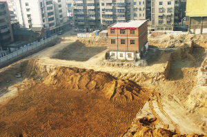 1月8日,河南省焦作市某舊城改造工地上矗立著孤零零的一棟樓。焦作市升恒房地產(chǎn)開發(fā)公司于2003年啟動(dòng)舊城改造項(xiàng)目的開發(fā),由于一戶搬遷戶要求賠償數(shù)額同開發(fā)商不能達(dá)成一致,成為了堅(jiān)持到底的“釘子戶”。幾年來,雙方始終未達(dá)成協(xié)議。耽誤不起工期的開發(fā)商先行對其他位置進(jìn)行開發(fā),從而形成了如今的場景。宏航 攝