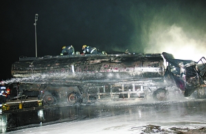 昨日21時(shí)許,通順路順義段李橋鎮(zhèn)聚順通加油站附近,一輛油罐車與一輛東風(fēng)集裝箱貨車相撞,油罐車起火報(bào)廢。大火威脅加油站安全,北京市消防總隊(duì)調(diào)集朝陽、順義、通州等區(qū)5個(gè)消防中隊(duì)趕往現(xiàn)場滅火。零時(shí)左右,火被撲滅,加油站沒有受到太大影響。油罐車司機(jī)失蹤,生死不明。