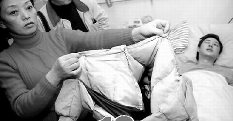 媽媽從床邊拿起一件乳白色羽絨衣,上面滿是腳印,已被撕扯得破爛不堪!爱(dāng)時(shí),我兒子就是穿著這件羽絨衣去采訪,事情發(fā)生后,三四個(gè)人沖上來搶攝像機(jī),我兒子把攝像機(jī)藏在羽絨服里,那些人搶不到機(jī)器,對他拳打腳踢,他的背上全是腳!”話未說完,媽媽就泣不成聲了。爸爸憐愛地注視著兒子,默默無言……
