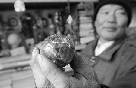 在郭國(guó)謙收藏室中任意掂出一件東西,都有一段故事。在收藏室一角的架子上,一枚直徑約有25厘米的綠色圓球引人關(guān)注,郭國(guó)謙將其拿至暗處,只見(jiàn)圓球發(fā)出熒熒微光!斑@就是人們常說(shuō)的夜明珠!惫鶉(guó)謙說(shuō)。