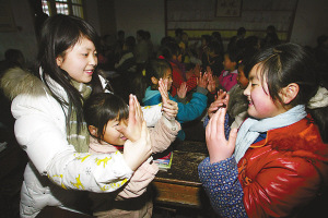 晚6時,東洲春蕾希望小學。住校的孩子們都已吃過晚飯,但停了一天的電依然沒來。一陣哨子聲響過,同學們又回到教室。一年級2班,數(shù)學老師姚川杰正和孩子們做游戲,教大家拍手和跺腳取暖!叭绻械娇鞓纺憔团呐氖!”跟著老師的節(jié)奏,孩子們的巴掌聲響成一片。