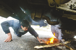 不遠處,一輛大貨車滑出了公路,而更多的貨車被困雪地!百FC08649”貨車司機任江虎將引擎蓋揭開,在發(fā)動機下升起一堆火:“發(fā)動機被凍住了,必須把它烤化!比握f,13日晚路過此地回貴州,遇大雪封山,于是停下等待至今。和任一道的還有六七輛車,司機也都在車頭下升火烤車,形成一道奇怪景觀。