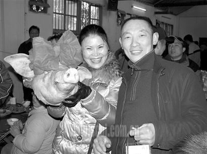 “好熱鬧,幾百個人一起殺豬團年,抽的獎品全是豬肉!”昨日,盡管氣溫降到了2℃左右,南充西山 “西湖樂”農(nóng)家樂卻熱鬧非凡,一群素昧平生的網(wǎng)友從四面八方聚集在一起,舉行殺年豬大團年活動,大家大塊吃肉,大碗喝酒,還進行各種娛樂活動,抽到的最高獎品則是戴著大紅綢緞的豬頭。