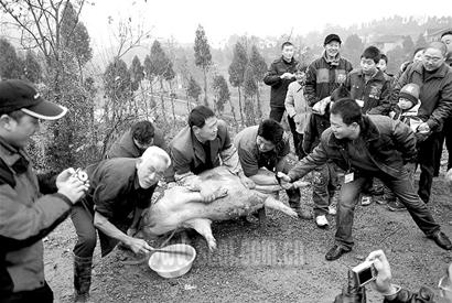 “大肥豬來了!”上午10點,人群中一聲高喊,只見一頭200多斤的大肥豬頭頂大紅花,正在農(nóng)家樂外的馬路上踱著方步,慢條斯理地朝網(wǎng)友們走來。此時,已有網(wǎng)友將一口大鍋里的水燒得滾開。待大肥豬一進院壩里,幾個力氣大的網(wǎng)友就上前幫農(nóng)家樂主人,“等到起,我來殺第一刀!”膽大的網(wǎng)友“江湖”從屠宰師傅手里拿過刀子,就準備往豬的脖子上刺,結(jié)果嚇得幾位女網(wǎng)友一陣尖叫。最后是在眾網(wǎng)友的一片閃光燈中,屠宰師傅親自上陣殺了肥豬。隨即大家又七手八腳澆水、褪毛,不到20分鐘,大肥豬就變得白白的了。