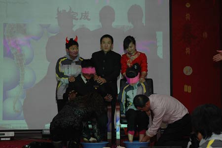 網(wǎng)友在帖子中描述說,幾日前的一個(gè)下午,自己在北辰企業(yè)的表彰會(huì)上經(jīng)歷了一場(chǎng)感人場(chǎng)面,在文藝演出告一段落、主持人宣布表獎(jiǎng)名單后,公司的兩位經(jīng)理上臺(tái)為兩位獲獎(jiǎng)員工頒獎(jiǎng),獎(jiǎng)品是華東五市游和一套豪華床上用品,讓所有嘉賓沒想到的是,主持人神秘地令兩人坐在幕簾后面,感動(dòng)在場(chǎng)所有人的一幕發(fā)生了:兩位公司經(jīng)理正跪著為朦住雙眼的兩位員工洗腳。