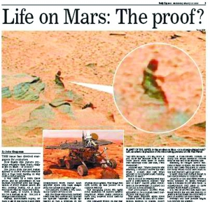 這張令人驚訝的火星照片顯示,在紅色星球的一處山坡上,一個(gè)腦袋碩大、如同“大腳怪”的黑色身影正揮著手臂走下火星山坡,它看起來又像是正坐在一塊石頭上休憩,還有人稱,照片上的“火星人”看起來像是一名女性。針對這幅“火星人”照片,英國《每日郵報(bào)》幽默地評論說:“她坐在一塊巖石上,像在等一輛公共汽車,不過如果真是這樣的話,她可能得面臨永無止境的漫長等待!薄短┪钍繄(bào)》則將這個(gè)“火星人”比喻成是藏得無影無蹤的本·拉丹:“它是一塊巖石,還是火星光線的錯(cuò)覺?或者是本·拉丹在遠(yuǎn)離地球3億英里遠(yuǎn)的荒蕪藏身處朝地球揮手?”