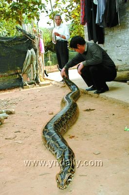 有時(shí)候夜間天冷時(shí),蟒蛇還會(huì)爬出房間,將楊建松臥室的門弄開(kāi),爬上床來(lái)與楊建松同床共枕,碰到楊建松睡覺(jué)翻身壓到身上時(shí),這條蟒蛇還會(huì)“自覺(jué)”地挪挪身子給他騰地方。這樣的狀況一直持續(xù)到楊建松結(jié)婚,將其安置在后院特制的鐵柜中才告結(jié)束。
