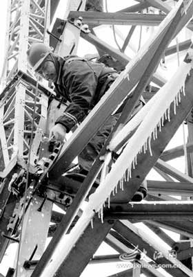 接替丁潤國這班的就是送飯來的12個人。他們系著安全帶,從塔底端一個接一個地爬上鐵塔,到達塔頂后,把塔下的鋼材用繩索運上并固定。鐵塔上有很多厚重的覆冰,電線上的冰直徑達十多厘米。