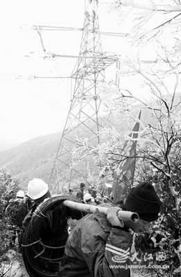 29日,一場大雪飄落南昌。12時30分,記者登上梅嶺主峰,來到海拔近千米的南夢線72號鐵塔,這是江西電網(wǎng)大動脈的一環(huán),它的修復(fù)以及再次運行將把來自三峽的“血液”直輸我省,填補1/3的用電缺口。