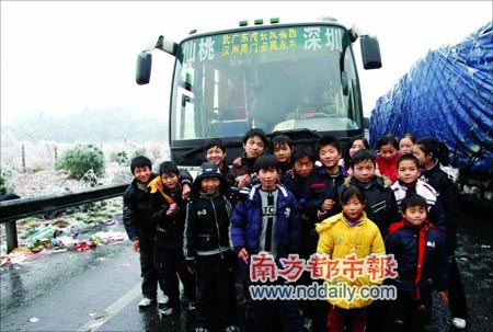 “記者同志,救救我們吧,我車上有20多個(gè)小孩!”昨日上午10時(shí)30分左右,南方都市報(bào)記者姜鏘和徐文閣正在京珠高速公路受災(zāi)最為嚴(yán)重的廣東省韶關(guān)市坪石入口附近采訪,一位穿著綠色軍大衣面容憔悴的司機(jī),攔下了記者的采訪車。