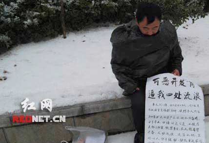 帖子陳述說,“1月29日,長沙的街頭雖然冰雪封凍,但仍然掩蓋不了春節(jié)的氣氛,到處呈現(xiàn)出過年的景象。本人剛從超市里購物出來,發(fā)現(xiàn)了這令人心酸的一幕,就用攜帶的相機拍了下來。經(jīng)過筆者簡單的問詢,照片中的人為湖北老河口市(屬襄樊市)的一公園游樂設施承包人,因為三證俱全的房產(chǎn)被政府有關(guān)部門定性為違章建筑,而拒絕賠付,并對其所屬的房屋進行強制拆遷,使其公道無處伸張,而流落街頭!