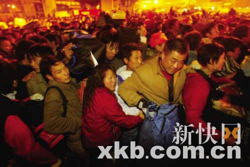 昨日上午,近20萬乘客正在各段阻隔帶前翹首等待,不少人都試圖擠向最前面的入口,人疊人、肩靠肩、背貼背。記者看到,無數(shù)的頭不斷地涌向車站廣場東西入口。大批警察、武警為分薄人群,減少因擁擠造成的傷亡,與解放軍戰(zhàn)士圍成一條長達十幾米的人墻,嚴防人群過度擠壓。