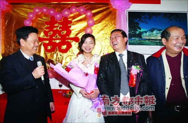 而得知這一消息后,昨日到施工工地慰問(wèn)建設(shè)者們的呂銳鋒和梁道行兩位副市長(zhǎng),為新人們當(dāng)了一回特殊的證婚人,除了給新人包上兩個(gè)大紅包,兩位副市長(zhǎng)都祝愿新人愛(ài)情美滿(mǎn),白頭偕老。