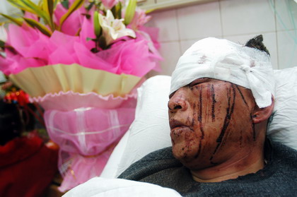 在爆炸中同樣驚魂的還有朱昆峽和老伴阮群。病床上,56歲的朱昆峽頭纏著厚厚的紗布,面部被高溫燙傷,紅腫發(fā)亮!拔覀?cè)缟蟿偝鲩T去給大娘過(guò)生,他在前面我走在后面!比钊赫f(shuō),當(dāng)他們走到14號(hào)時(shí),突然發(fā)生了煤氣爆炸,老伴朱昆峽頓時(shí)便不見(jiàn)了人影。阮群說(shuō),在慌亂的人群中突然發(fā)現(xiàn)一個(gè)滿臉是血、雙手抱著頭的人,“我說(shuō)這個(gè)老頭咋沒(méi)人管喃,便趕緊上前去攙扶,才發(fā)現(xiàn)居然是自己老伴!比钊赫f(shuō),爆炸來(lái)得太突然了,很多人根本來(lái)不及躲藏就被爆炸產(chǎn)生的高溫和熱浪擊翻在地,受傷者中許多人血流滿面,有的被玻璃擊中頭部和眼睛。