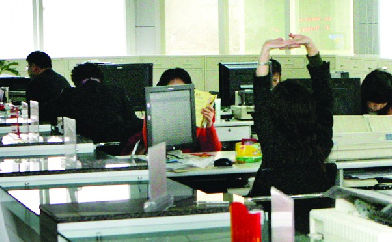 在辦事大廳西北角一間“辦公室”里,記者看到里面坐著不少人。緊接著,一個聲音傳來,“這是上班第一天,不要上網(wǎng)打游戲讓記者曝光!币幻捌筋^”男子說。