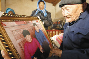 每天早晨,兩位老人的生活一般是這樣——王希賢天亮就會(huì)醒來(lái),扭開(kāi)床頭的收音機(jī),聽(tīng)聽(tīng)報(bào)時(shí),然后起床。拿起煙鍋,默默望著窗外,抽一支旱煙。要是天晴,他會(huì)叫醒老伴,一起顫顫巍巍相互攙扶著來(lái)到院子里曬太陽(yáng)。若是陰天,他就叫兒媳把火盆端過(guò)來(lái),邊烤火邊抓一小把茶葉放到杯子里,沖上一杯濃茶,望著煙霧與蒸汽發(fā)呆。
