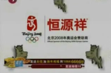 春節(jié)期間,中央電視臺、東方衛(wèi)視、湖南衛(wèi)視等播出恒源祥集團(tuán)的賀歲形象廣告。廣告中,低沉的男聲反復(fù)12遍“恒源祥,北京奧運(yùn)會贊助商!蓖暷畛龅氖っQ穿插其間,從“鼠鼠鼠”、“牛牛!保钡健柏i豬豬”。廣告畫面以奧運(yùn)中國印和恒源祥商標(biāo)為底,十二生肖的卡通圖案依次閃過。廣告時(shí)長1分鐘。