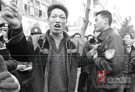 據(jù)李賢堂說,其家兄弟4人來昆明已有多年。二哥李賢友以前受過傷,醫(yī)治好后便身帶殘疾,與二嫂在昆明做米線生意。上午10點(diǎn)左右,他知道二哥送餌塊途經(jīng)人民東路時(shí)被城管打了,就迅速跑了來!翱吹蕉缣稍诘厣希D塊散落一地,我就跑到一輛白色面包車前,攔住去路,沒想到,七八個(gè)男子就過來打我,他們那么多人,我咋個(gè)還手,打得我頭昏眼花,我只好抓住先打我的那個(gè)不放手。”