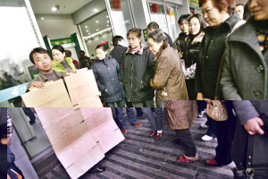 昨日中午1時許,兩名男子和一名婦女來到儲蓄所門前,高舉一個寫有“我在這里取到假錢”的紙牌子。舉牌子的男子叫汪登渝,長壽人,是進城務(wù)工的農(nóng)民工。“我昨天中午在這取了5000元準(zhǔn)備借給小舅子,半小時后我們走到家樂福后發(fā)現(xiàn)錢是假的!蓖粽f,當(dāng)時他在自動取款機上分三次取錢(前兩次各取2000元,第三次取1000元),點清數(shù)額后將現(xiàn)金和卡帶離儲蓄所,隨后來到家樂福買東西時發(fā)現(xiàn)異常,“我看到錢上的頭像是黃色的,就覺得有問題!蓖舻男【俗狱S先生說。不過,對于汪登渝半小時內(nèi)的行程,只有其小舅子能夠作證。