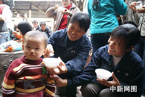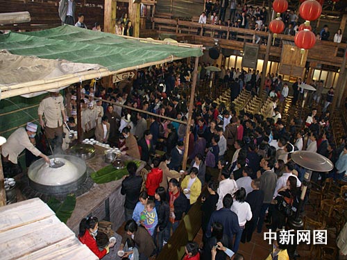 “吃湯圓,賣湯圓,一碗湯圓三毛錢!痹趧勇牭母柚{聲中,游客臉上都帶著興奮的笑容,按順序排隊等候工作人員的分吃湯圓。記者粗略的估計了一下,10余工作人員耗時一個多小時才把大湯圓分完。