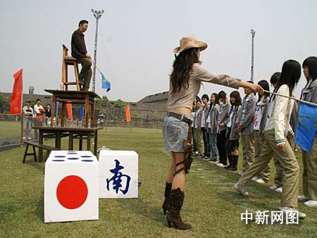 參賽者通過(guò)紅旗指揮著每個(gè)美女麻將牌,被點(diǎn)到打出去的麻將牌,充當(dāng)麻裝牌的美女就把風(fēng)衣脫掉,露出里面的麻將牌。然后用舞蹈、體操、武術(shù)的動(dòng)作跳到草地中間去,轉(zhuǎn)上一圈。
