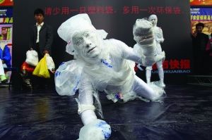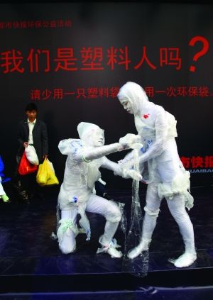 兩個(gè)被塑料袋緊緊包裹、渾身慘白的人,舉步艱難,倒在地上痛苦地掙扎;其他幾個(gè)外表正常的人,也不由自主地受到塑料袋的束縛,逐漸喪失行動(dòng)能力……昨天下午,在杭州東新園沃爾瑪超市門外的廣場(chǎng)上,一場(chǎng)由本報(bào)發(fā)起、杭州環(huán)保志愿者一起參與的、以“我們是塑料人嗎”為主題的現(xiàn)場(chǎng)行為藝術(shù),牢牢抓住了過往行人的眼球,他們圍了個(gè)里三層外三層,看清楚之后,發(fā)出這樣的驚嘆,“哦,原來是這樣的!”