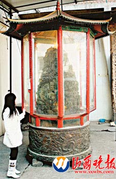 記者在劉學(xué)勤家看到,這塊大玉石陳列在院子里一個鋼制八角亭內(nèi),亭子四周安裝著鋼化玻璃。大玉石加上底座有3米高,青翠的胎面,雕刻著泰山、華山、恒山、衡山、嵩山五岳山水奇觀。