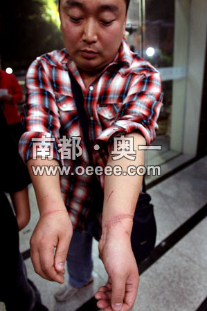 昨日凌晨3時(shí)許,深圳市羅湖區(qū)文華花園發(fā)生一起跳樓事件。南方都市報(bào)兩名記者馬小六、王子榮接到報(bào)社指令后趕到現(xiàn)場(chǎng)亮明身份采訪,遭到現(xiàn)場(chǎng)兩名警察辱罵、威脅、推搡和毆打。其中,馬小六被一警察反銬雙手,后又遭“鎖喉”。