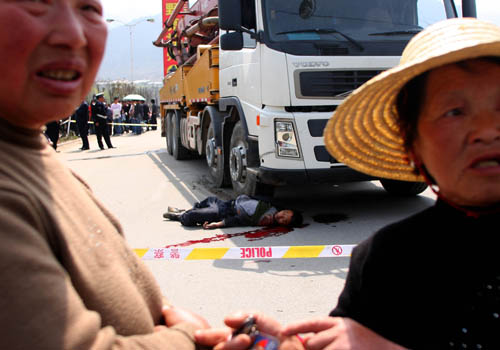 上午12時(shí)30分許,記者趕到現(xiàn)場(chǎng),看到一輛黃色的混凝土輸送泵車(chē)被人群包圍著,一位身穿黃色制服的交通征稽執(zhí)法人員,坐在駕駛室里趴在方向盤(pán)上一動(dòng)不動(dòng)。記者擠進(jìn)人群看到,一位中年民工躺在車(chē)的右前輪子前面的血泊中,人已經(jīng)死亡。周?chē)娜罕、游客情緒激動(dòng),指著車(chē)上的執(zhí)法人員罵聲一片。
