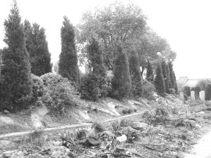 記者在玉筍山南山腳下一片每平米15000元—30000元、平均每墓6平方米的藝術(shù)葬區(qū)背后,終于找到了“簡(jiǎn)陋”的樹(shù)葬園區(qū)。這片園區(qū)總共不過(guò)200平米,共有樹(shù)墓19座。樹(shù)與樹(shù)間雜草叢生,有些矮小的墓碑甚至已被雜草湮沒(méi)。而樹(shù)葬區(qū)西端,竟然是一片垃圾場(chǎng),里面遍布著殘碑?dāng)嗍,還有焚燒過(guò)的渣滓。