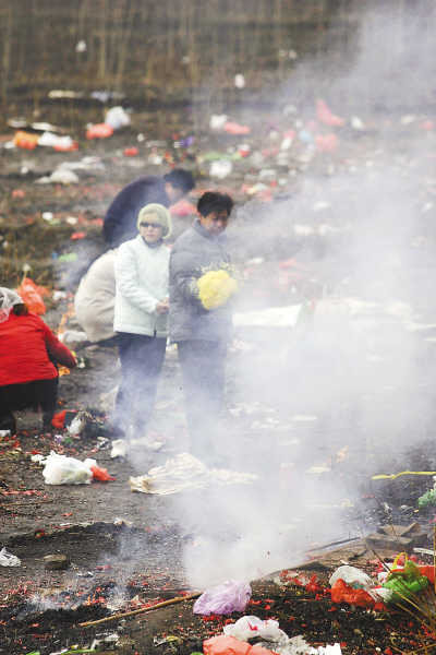 3月29日8時(shí)30分,位于石家莊市西郊的河北省雙鳳山革命陵園,緊鄰陵園的道路已是車水馬龍,在陵園設(shè)置的集中祭奠點(diǎn),紙錢燒處,人頭攢動(dòng),煙霧繚繞。稍稍有一點(diǎn)風(fēng),紙灰就會(huì)漫天飄舞。即使有人手捧鮮花來(lái)祭奠,也不忘帶上紙錢、冥幣等傳統(tǒng)祭奠品。