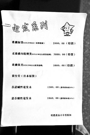 在該店提供給工商部門的材料中,兩名女學(xué)生的消費(fèi)清單上寫有“水洗剪吹38元,資生堂特護(hù)1800元,資生堂酸性1860元,蠢絲蛋白680元,歌薇果酸洗60元,歌薇果酸護(hù)60元”等字樣。