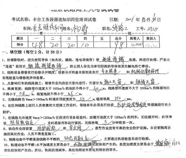 一審過(guò)程中,北京市鐵路局提供了一份試卷,法院據(jù)此認(rèn)定“從其工作狀態(tài)及崗位培訓(xùn)考試成績(jī)來(lái)看,其智力、精神狀況未受影響!睂(duì)于法院用一份試卷否定司法精神醫(yī)學(xué)鑒定結(jié)論,黃樂(lè)平律師難以理解:“在一審中,楊濤的親屬多次否認(rèn)單位遞交的試卷的真實(shí)性,并向法院遞交了楊濤的筆跡,以供一審法院查明事實(shí)。但是,法院最終還是憑這份有偽造嫌疑的試卷,推翻專(zhuān)業(yè)司法鑒定機(jī)構(gòu)所作的司法精神鑒定!