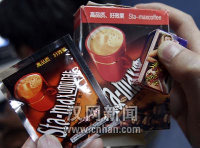 火鳳凰成人保健用品公司的貨架上還擺了一種催情咖啡,沒(méi)有廠(chǎng)名、廠(chǎng)址,方形外包裝與雀巢咖啡十分近似,每盒有8小袋。說(shuō)明稱(chēng)每袋催情咖啡對(duì)入150毫升開(kāi)水沖泡,30分鐘見(jiàn)效。店員稱(chēng)其口感與速溶咖啡類(lèi)似,批發(fā)價(jià)每盒18元。
