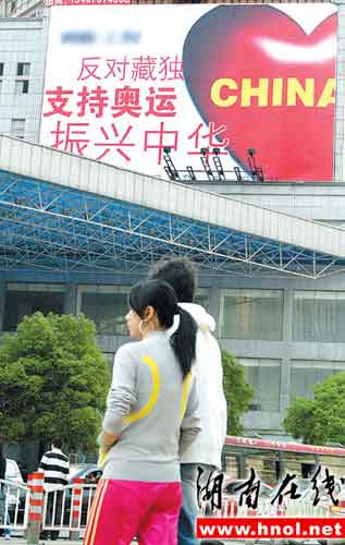 長(zhǎng)沙王先生4月23日來(lái)電:你知道網(wǎng)上QQ上很熱的“中國(guó)心”頭像么,有人在八一橋附近的一棟高樓上,掛出“中國(guó)心”巨型橫幅!上面寫(xiě)了“反對(duì)藏獨(dú),支持奧運(yùn),振興中華”,讓人眼前一熱!