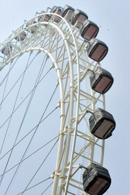 記者在施工現(xiàn)場(chǎng)看到,永樂(lè)橋摩天輪的外圈掛滿了黑色廂體,整整48個(gè),施工人員只用了兩天的時(shí)間就將它們?nèi)堪惭b到位。據(jù)介紹,在安裝座艙之前,摩天輪就已經(jīng)通過(guò)了抗壓、抗?jié)B、抗折、抗凍等強(qiáng)度試驗(yàn),并完成了電力驅(qū)動(dòng)裝置的安裝,前期準(zhǔn)備工作一切就緒,座艙運(yùn)到后立即安裝,所以才如此神速。施工人員告訴記者,座艙是完全透明的,非常漂亮,但為了避免它們?cè)谑┕み^(guò)程中受到污染及損壞,才給它們都套上了一個(gè)黑色的罩子,以起到保護(hù)的作用。