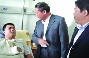 昨天下午5點左右,棲霞區(qū)委副書記李漢橋和副區(qū)長金政權手捧鮮花,來到省中西醫(yī)結(jié)合醫(yī)院住院部王騏的病房。見有人前來探望,躺在病床上的王騏準備坐起來,李漢橋趕緊示意他躺著不要動。