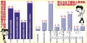 對(duì)“過(guò)青年節(jié)”,32.7%的人抱無(wú)所謂的態(tài)度,32.6%的人表示不喜歡過(guò)青年節(jié),他們認(rèn)為這個(gè)節(jié)日只是停留在名義上的傳統(tǒng)節(jié)日,諸如講座、演講之類的紀(jì)念活動(dòng)毫無(wú)吸引力。