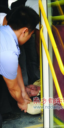逃出生天后,陳先生迅速跳下車。“我的腳都發(fā)麻了,要好好活動一下筋骨。那個人有神經(jīng)病,我都不認(rèn)識他,F(xiàn)在我的脖子還痛得要命,真想狠狠揍他一頓。”陳先生憤怒地對記者說。記者發(fā)現(xiàn),陳先生喉嚨邊已經(jīng)被鋼筋頂?shù)冒l(fā)紅,周圍還有小小的劃痕。