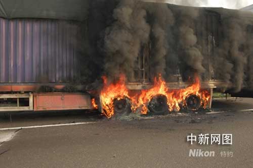 當(dāng)天早晨6時許,一輛車牌為冀AF3978(掛車牌照為冀AZ747)的大貨車在京珠高速臨長路段由北往南50公里處行駛時,車輛右后胎因為摩擦突然起火。隨后,車上裝載的雞蛋的紙盒也很快燃燒起來,駕駛?cè)笋R上報警。