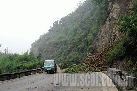 5月12日17點(diǎn)14分,都江堰往汶川方向道路被山頂滾落的巨石阻斷,車輛無法通過,路人試圖翻越巨石堆
