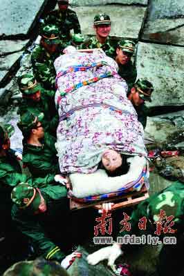 14日上午,汶川特大地震重災(zāi)區(qū)之一的北川縣城,不斷有幸存者從建筑廢墟下獲救,整個(gè)上午,來自四川、重慶、陜西等地的數(shù)十輛救護(hù)車不斷地將獲救者送往鄰近的安縣、綿陽等地的醫(yī)療點(diǎn)醫(yī)治。這些幸存者在建筑廢墟下已堅(jiān)持了40多個(gè)小時(shí),大部分傷勢(shì)嚴(yán)重。