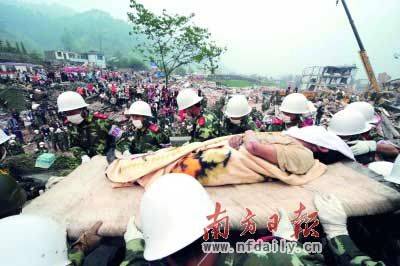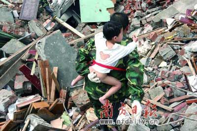 “我一定要找到家里人,死也要死到一起!痹诰d陽(yáng)市開(kāi)出租車(chē)司機(jī)胡女士說(shuō)。出事后,她開(kāi)車(chē)前往北川找她的愛(ài)人。當(dāng)天下午5點(diǎn)多,她趕到時(shí)小縣城已面目全非。胡女士徒步來(lái)到愛(ài)人上班的新城區(qū),在廢墟上大聲叫著丈夫的名字。終于,丈夫有了回應(yīng):“我在這里,背上有塊大石頭!”胡女士蹲下來(lái)說(shuō):“不要怕,很快有人來(lái)救我們了。”為了讓愛(ài)人不因?yàn)榭只藕褪а^(guò)多昏睡過(guò)去,胡女士跪在地上和愛(ài)人談起往事,不斷鼓勵(lì)、安慰他。半小時(shí)后,巡邏人員發(fā)現(xiàn)他們,胡的愛(ài)人獲救。而胡女士本人,則因?yàn)殚L(zhǎng)時(shí)間跪在一塊碎玻璃上,被割掉一大塊肉。(作者:記者胡亞柱張蜀梅)