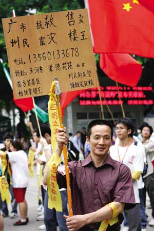 昨日,有一個(gè)人,隨著號(hào)召募捐行動(dòng)的志愿者隊(duì)伍,從正佳廣場(chǎng)西北門的活動(dòng)現(xiàn)場(chǎng)一直跟到另一主會(huì)場(chǎng)僑鑫教育大院。他始終默默站著,沒和任何人說話;而他手上,則舉著一塊自己制作的簡(jiǎn)陋牌子,上面寫著“廣州市民抗震救災(zāi)售賣樓王”,引來好多路人觀望。