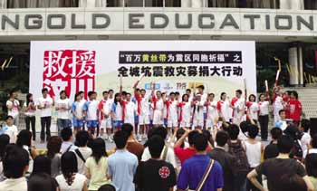 昨日下午2時,由新快報、廣州電臺FM102.7、南方電視臺、新浪網(wǎng)四大媒體攜手廣東省慈善總會,在正佳廣場西北門和廣東新快報社主樓前(天河路533號僑鑫教育大院)兩大主場,舉辦“祈福同胞,愛心飛揚———百萬黃絲帶為震區(qū)同胞祈福之全城抗震救災(zāi)募捐大行動”;顒舆在廣州崗頂好又多、天河城、江南西-廣百新一城、天河購書中心-維多利亞廣場、正佳廣場、友誼商店-世貿(mào)、荔灣廣場南門-上下九、中華廣場-流行前線、北京路-廣百、新光廣場-康王路、越富大廈等11個繁華地段設(shè)50個流動募捐點,廣州青年志愿者協(xié)會還派出超過300名志愿者。