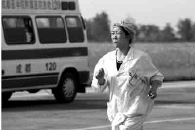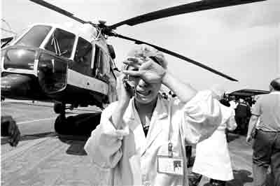 昨天下午4點05分,東方通用航空公司的一架米1-71直升機緩緩降落在廣漢機場停機坪上。艙門打開,40歲的女護士杜娟下了飛機,招呼著成都120急救中心的醫(yī)護人員將傷員抬到急救車上。杜娟是北川縣禹里羌族鄉(xiāng)衛(wèi)生院的護士。5·12地震后,禹里與世隔絕,直到昨天才等到直升機將重傷者送出。杜娟隨機照顧患者。傷員都下了飛機后,杜娟向于波借手機,電話打通時,她手開始顫抖,撕心裂肺的哭聲終于無法忍住。那是她六天后,第一次給外面的親人打電話。巨大的螺旋槳轉(zhuǎn)動聲中,人們只能依稀聽到她的哭訴:“我要去找他,不能連個尸體都沒有!庇诓乜粗,不到一個小時前,他還覺得這個女護士嚴厲得有點過分。