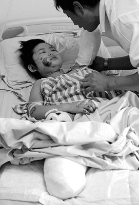 “媽媽,我的手腳呢?”這是昏迷4天的羅穎醒來后對媽媽說的第一句話。前日上午10時,看著剛剛醒來身體還很虛弱的女兒,陳樹彬眼眶含著淚看著女兒。母女倆相視幾分鐘后,陳樹彬說:“穎穎,你的左手和右腿受了很重的傷,已經(jīng)被包扎好了,你身體虛弱所以沒有感覺,你傷好了,扯了紗布就有感覺了!甭犞拮优c女兒的對話,坐在一旁的袁海轉(zhuǎn)身,抹了一把眼淚,但隨即轉(zhuǎn)過身,看著女兒望過來的目光強顏微笑。(特派記者 李雙全 鐘臻)