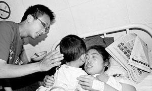 5月13日,在汶川映秀鎮(zhèn),受重傷的母親雷君將4歲的兒子劉毅托付給本報(bào)記者。記者“爬”30里山路將劉毅帶出災(zāi)區(qū)。此前,雷君以為她和兒子是永別,昨天,她被直升機(jī)營(yíng)救出,母子重逢。